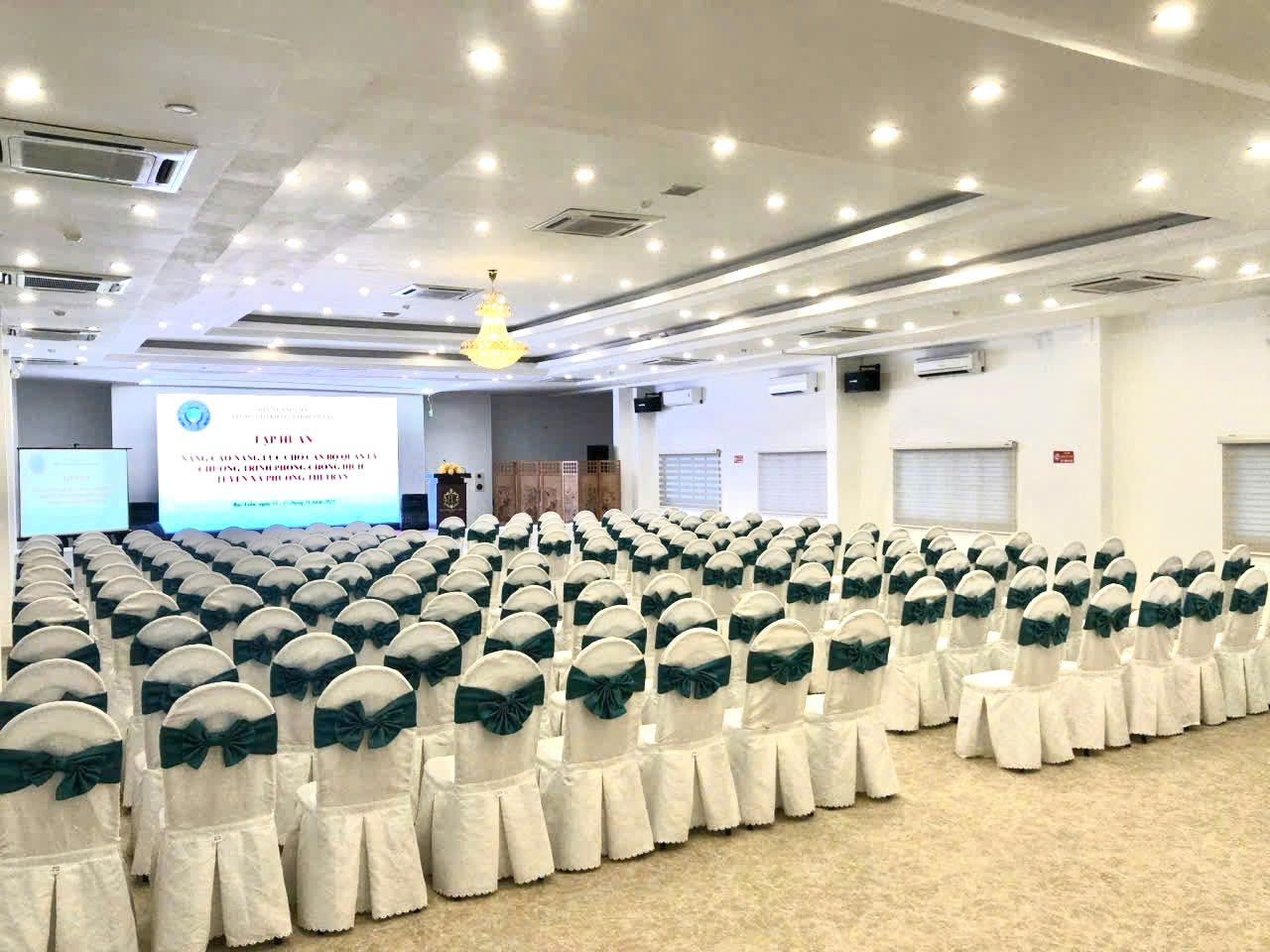 Sân khấu, bục phát biểu, wifi siêu tốc. Máy lạnh, ánh sáng tiêu chuẩn